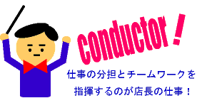 この仕事の分担とチームワークを指揮するのが店長の仕事になります。